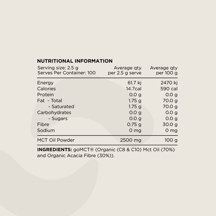 Perfect for those seeking enhanced mental clarity, steady energy, and metabolic support, this unflavoured MCT oil powder blends effortlessly into coffee, shakes, or smoothies — making it ideal for ketogenic, low-carb, or active lifestyles.